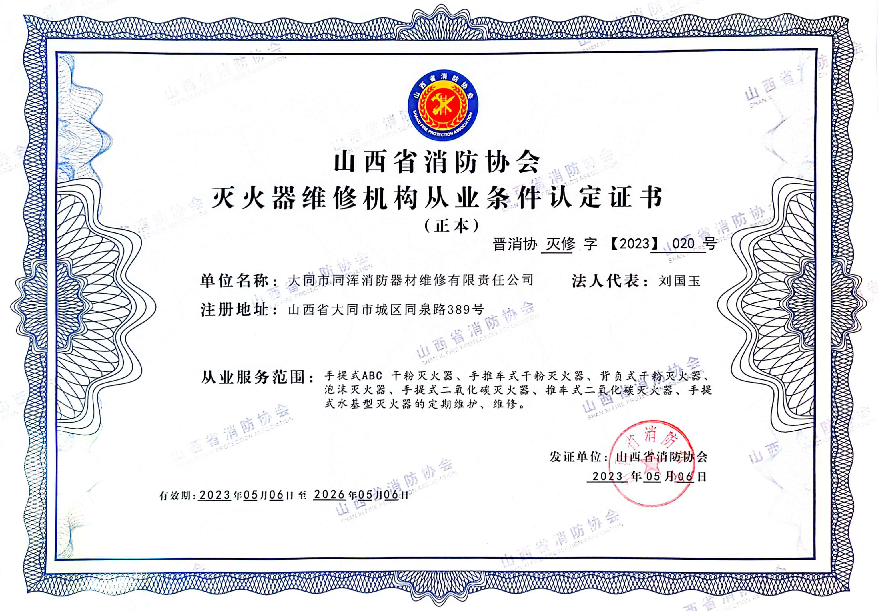 大同市同渾消防器材維修有限責任公司,位于大同市同泉路389號,始建于2000年,是公安部消防局定點銷售和維修的企業(yè),歷經(jīng)多年的創(chuàng)建、發(fā)展和拼搏,現(xiàn)有多家消防器材廠商供應(yīng)我公司,并有現(xiàn)代化維修設(shè)備,標準的廠房,嚴格的管理,優(yōu)良的設(shè)備,良好的服務(wù)并受到各行各業(yè)的好評。總經(jīng)理劉國玉嚴格管理,嚴格要求,精益求精,認真負責,帶領(lǐng)團隊熱烈歡迎各界朋友顧客光臨。